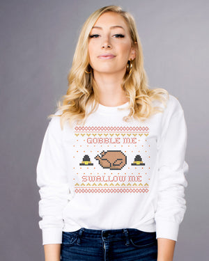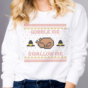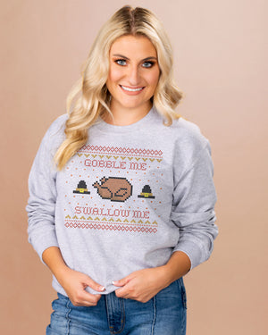 Make your Thanksgiving look edgy and fun with our Gobble Me Sweatshirt! This stylish design features bright colors and a trendy message that'll make you stand out among the hordes of pilgrims.