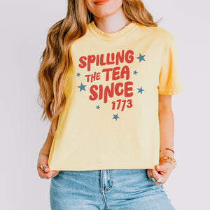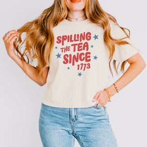 Get ready to celebrate Independence Day with a touch of historical sass in our 'Spilling the Tea Since 1773' graphic top! This shirt pays homage to the iconic Tea Party with a witty twist. Featuring a stylish hand-illustrated design, this slightly cropped tee is the perfect blend of patriotism and humor.