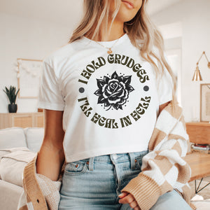 Unleash your inner rebel with the I Hold Grudges Crop Tee. Featuring a bold statement, this tee is perfect for those who aren't afraid to show their tough side. Made with comfy fabric, this tee will keep you feeling confident and ready to take on the world (or your enemies).