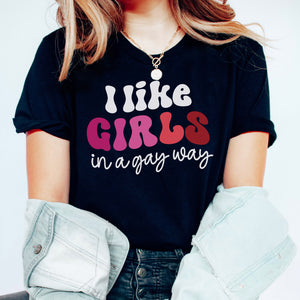 Show off your lesbian pride in style with this funny Like Girls In A Gay Way Shirt! Crafted from comfortable cotton, this piece of casual fashion is perfect for a relaxed night out - or in! Cut for a flattering fit, it's sure to get you the compliments you deserve.