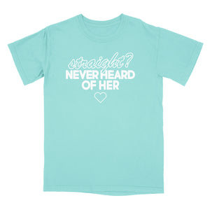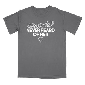Meet your new favorite tee: bold, cheeky, and proudly queer. Our “Straight? Never Heard of Her” graphic tee is made for turning heads and starting conversations. Featuring soft, breathable cotton and a relaxed fit, it’s perfect for pride parades, protests, or just living loudly. Wear it with pride—because subtle was never the vibe.