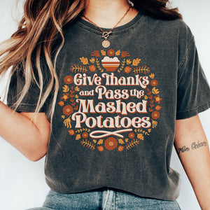 This "Pass The Mashed Potatoes" shirt is so cute, it'll make your Thanksgiving dinner guests stop and take notice! Whether you're out celebrating with family, or just lounging around at home, you'll be sure to look festive in this classic, funny shirt. Let the holiday festivities begin!
