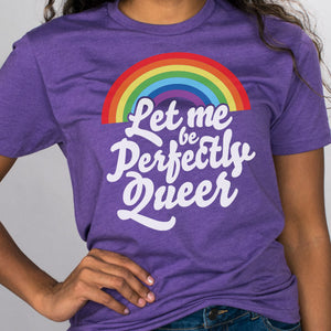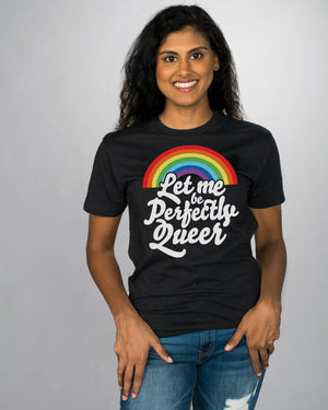 Make a statement and celebrate being queer in this unique shirt! This colorful and fashionable design features the words "let me be perfectly queer" - a perfect way to share your pride! Whether you're out and about or lounging around, you'll look great and feel inspired in this comfortable and stylish tee.