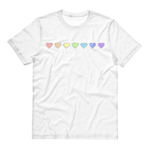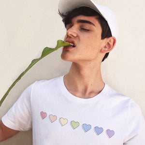 Show off your pride in style with this cheerful pastel rainbow heart tee! Perfect for the warmer months, it's sure to add some colorful vibrancy to your summer wardrobe. Stand out and feel bold in this statement look! 🌈