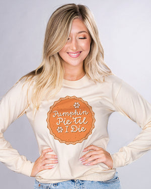 Enjoy Thanksgiving forever and ever with this "Pumpkin Pie Til I Die" long sleeve shirt! Get into the spirit of the season with this cozy, cute, and comfy shirt, perfect for your next turkey-filled celebration. Let the world know that you're ready to show your love for pumpkin pie!