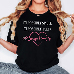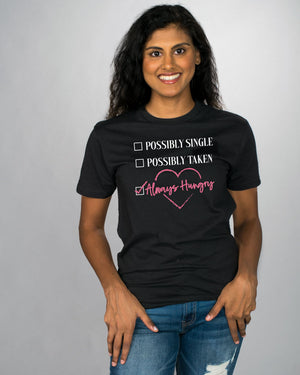 Show off your sense of humor this Valentine's Day with our Single Taken Hungry Shirt! This funny shirt is perfect for those who aren't fans of the holiday or just love food. Let everyone know your status and your hunger with this quirky and playful tee. (Note: May cause laughter and hunger pangs).