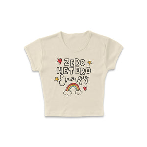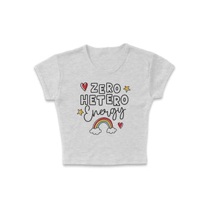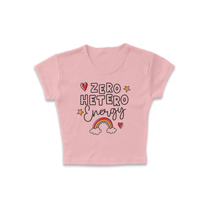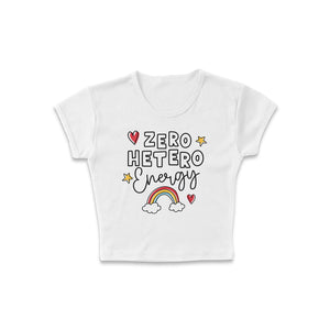 Serve unapologetic queer energy with our 'Zero Hetero Energy' women's baby tee. Fitted, fierce, and made to turn heads—this top says what it needs to say so you don’t have to. Comfy enough for everyday wear, bold enough for the gay pride parade. Wear it proud, loud, and with a little attitude.