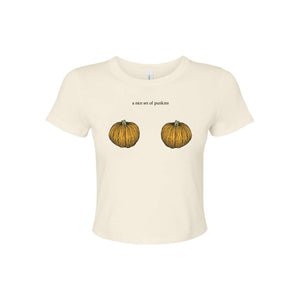 Celebrate the fall season with this trendy graphic baby tee featuring a set of cute pumpkins. Made from soft, high-quality cotton, this shirt is perfect for cozy autumn days and festive gatherings. Its playful design adds a fun touch to any casual outfit, making it a must-have for pumpkin lovers.