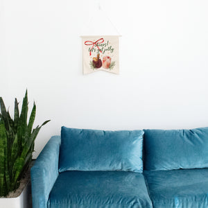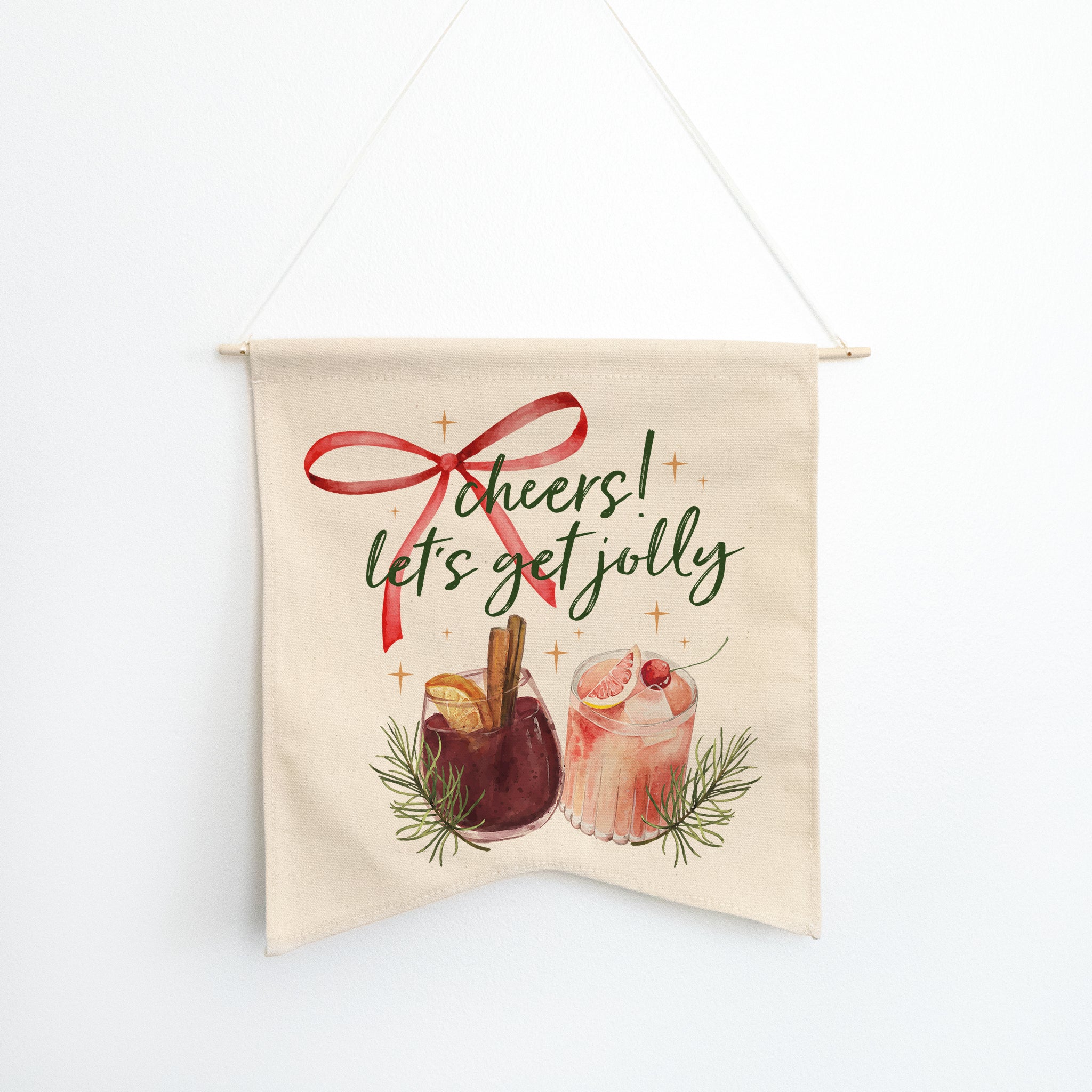 Raise a toast to the season with our 'Cheers! Let’s Get Jolly' wall hang. Made from high-quality natural canvas, this festive Guidon-style pennant features a sturdy dowel and ribbon for effortless hanging. Perfect for your bar area, kitchen, or holiday party space, it adds a cheerful and inviting touch to your décor. Bring on the bubbles, laughter, and holiday spirit - because it’s time to get jolly in style.