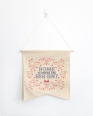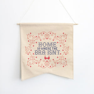 Bored with your walls? Wish there was more to them than just pictures that you still haven’t hung? Please meet the Home Is Where The Bra Isn't Wallflower, not your average wallflower! A two-point, Guidon-style wall pennant with a dowel and ribbon for hanging. Be cool, just hang.