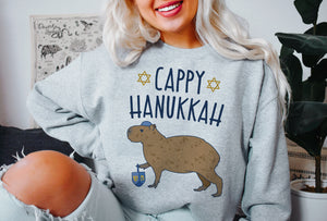 Celebrate Hanukkah with a cuddly twist! This hilarious and adorable Cappy Hanukkah crewneck sweatshirt will put a smile on your face every time you wear it! With a design featuring a cute capybara in festive Hanukkah garb, you'll be the life of the party