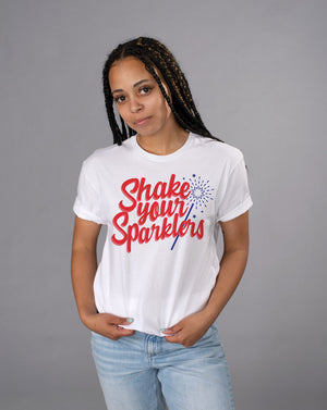 This Fourth of July, shake your sparklers in style with this adorable ensemble! The soft, summery fabric makes it perfect for a hot summer day. Plus, it's adorned with the cutest sparklers, sure to make you shine. Get ready to paint the town red, white, and blue!