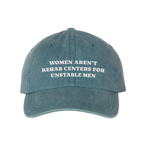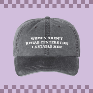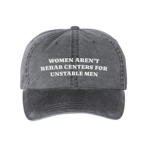 Make a bold statement with this empowering pigment-dyed cap. Featuring the impactful phrase, "Women Aren't Rehab Centers for Unstable Men," this dad hat combines style with a strong message. Made from high-quality fabric, it offers a comfortable fit and is perfect for those who stand firm in their confidence and self-worth.