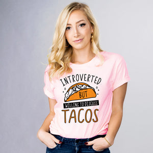 Introducing the perfect shirt for the introvert with an extroverted appetite! Show off your love of tacos with this "Willing to Discuss Tacos" Tee! Perfect for Taco Tuesday or any day of the week.